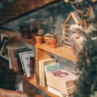 Warm sunlight on a wooden bookshelf filled with books and potted succulents in Dalat, Vietnam.